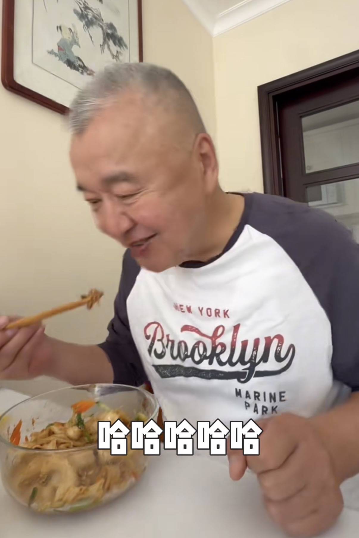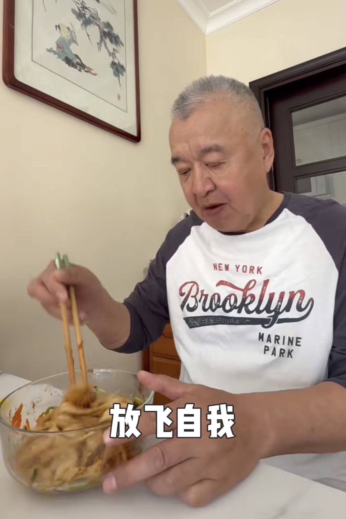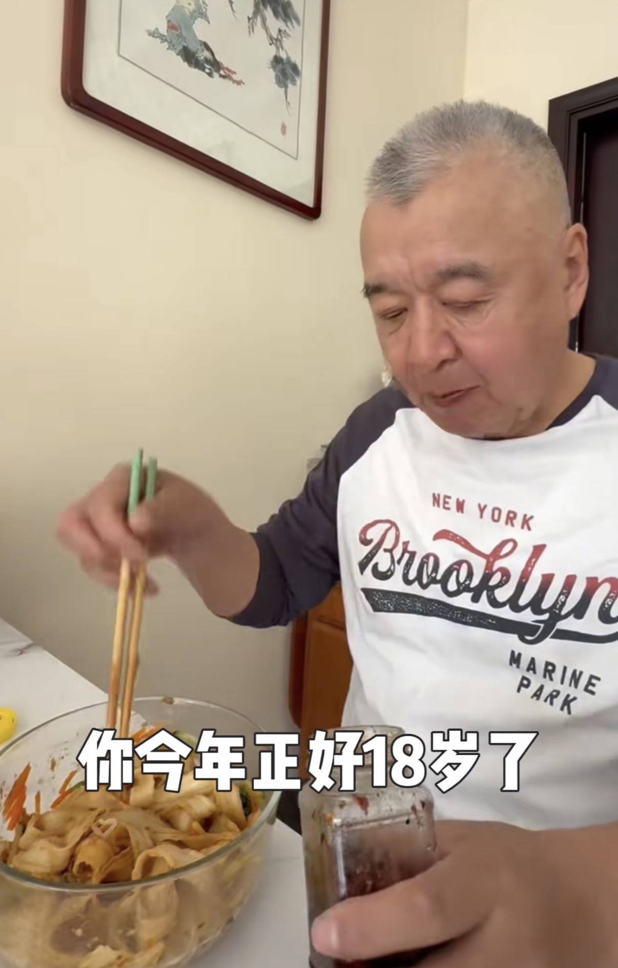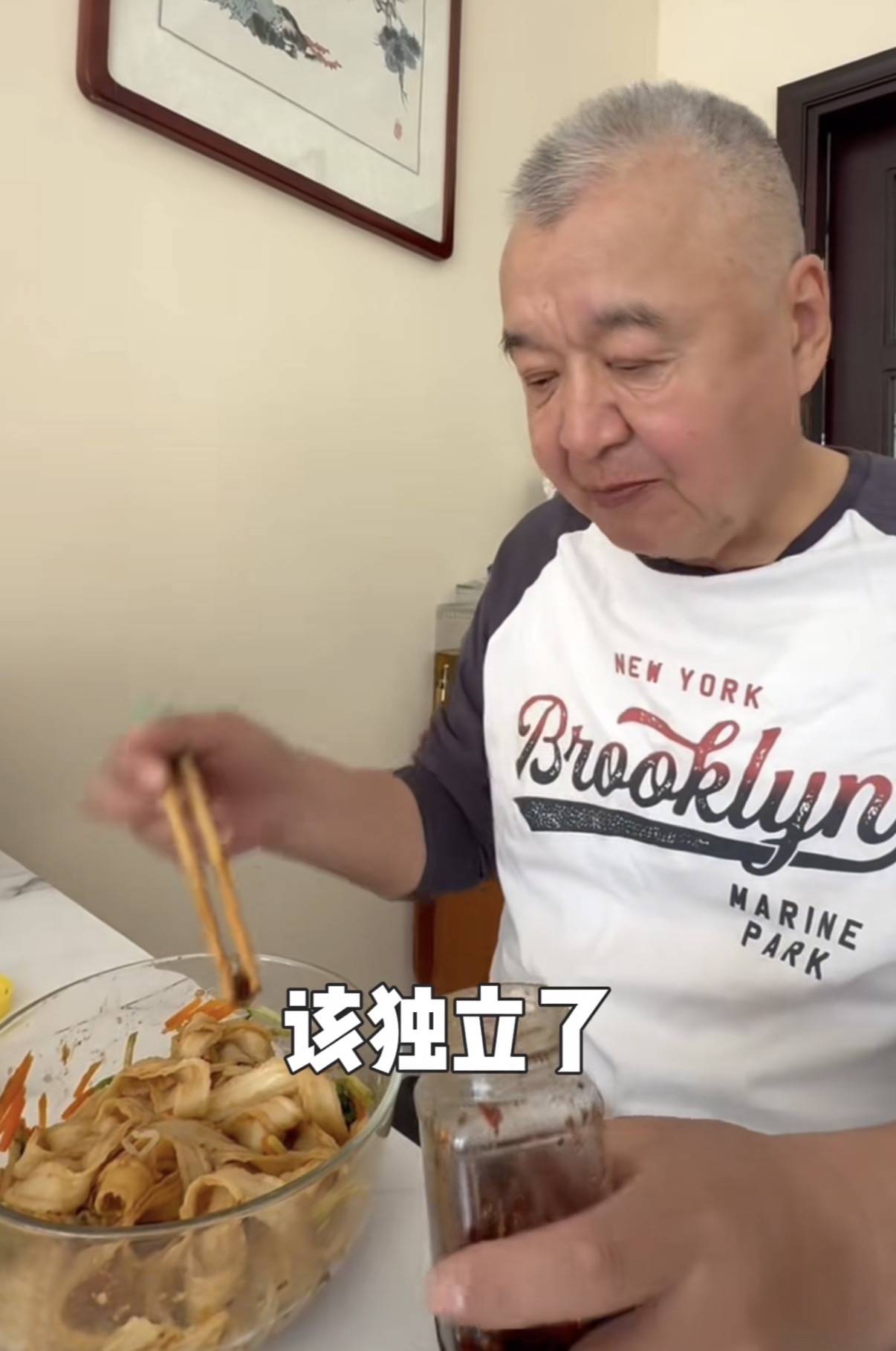可能是因为味道有些清淡,高父吃面的时候又加了一勺辣酱。老爷子应该七八十岁了吧,看着精神头很好,浓眉大眼的年轻时候一定很帅气。