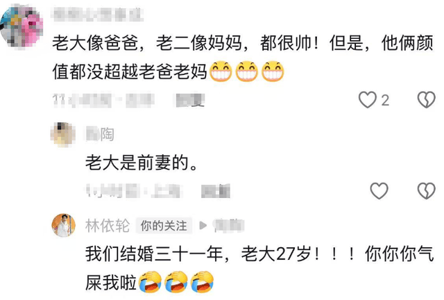而在这条评论下有网友还表示林依轮大儿子并不是他与西华生的,而是与前妻生的,没想到林依轮还回应了,他写道:“我们结婚三十一年,老大27岁,你气死我啦”,由此可见大儿子也是他和西华所生。