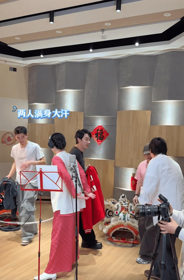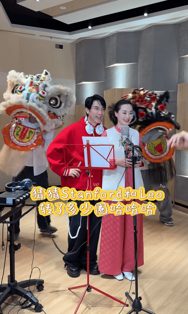 写完春联,吃了饺子的林依轮一家,他们开始录制新年歌曲,林依轮和妻子西华负责唱歌,俩儿子则充当背景板在后面舞狮,一家四口在一起的家庭氛围温馨又欢乐。