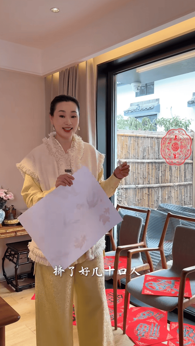 盘起一头长发的西华发型利落,妆容自然清透,唇色柔和,面带微笑,神态从容自信,展现出成熟女性的优雅与亲和力。对于即将到来的春节,西华和家人开始贴窗花写福字布置家里,节日氛围感好浓。