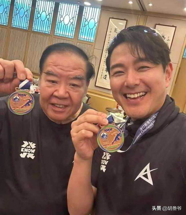 比赛当天,他穿着轻便的运动装,别着号码布,和一群年轻人站在同一起跑线,周润发更是放弃了自己准备已久的半马目标,全程陪在他身边跑。