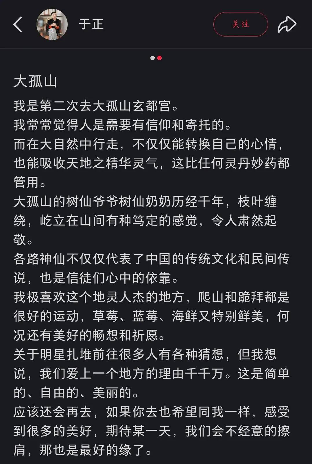 于正绝口不提玄都宫,只说大孤山的树和空气,表示自己把爬山、跪拜当运动,还夸大孤山的水果好吃,强调明星扎堆前往大孤山是去感受美好的。