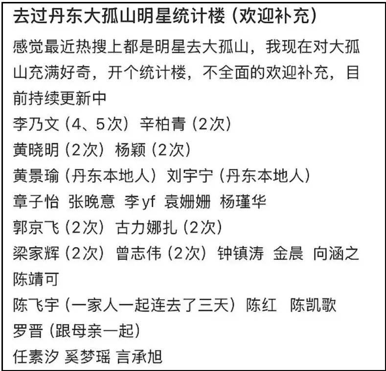 目前,已经有网友整理了前往大孤山的明星名单,根据不完全统计,去过大孤山的明星名人竟然近50人,还是仅仅算了近期的,时间再往前数,还有关之琳、方芳、姜育恒等老牌明星去过大孤山,细数下来,早就超过50人了。