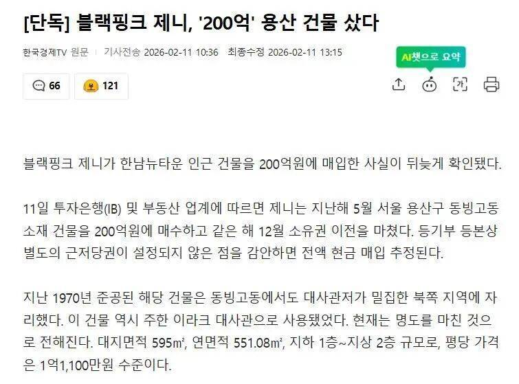 据韩国媒体2月11日最新报道,一则关于BLACKPINK成员Jennie以高达200亿韩元(约合人民币1.05亿元)购入首尔核心地段建筑的消息,在投资银行与房地产界流传后得到确认,再度展现了这位