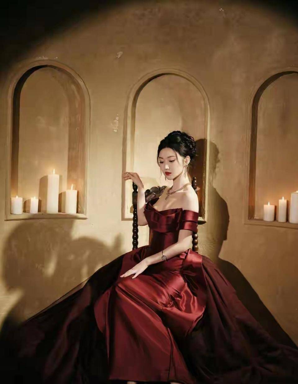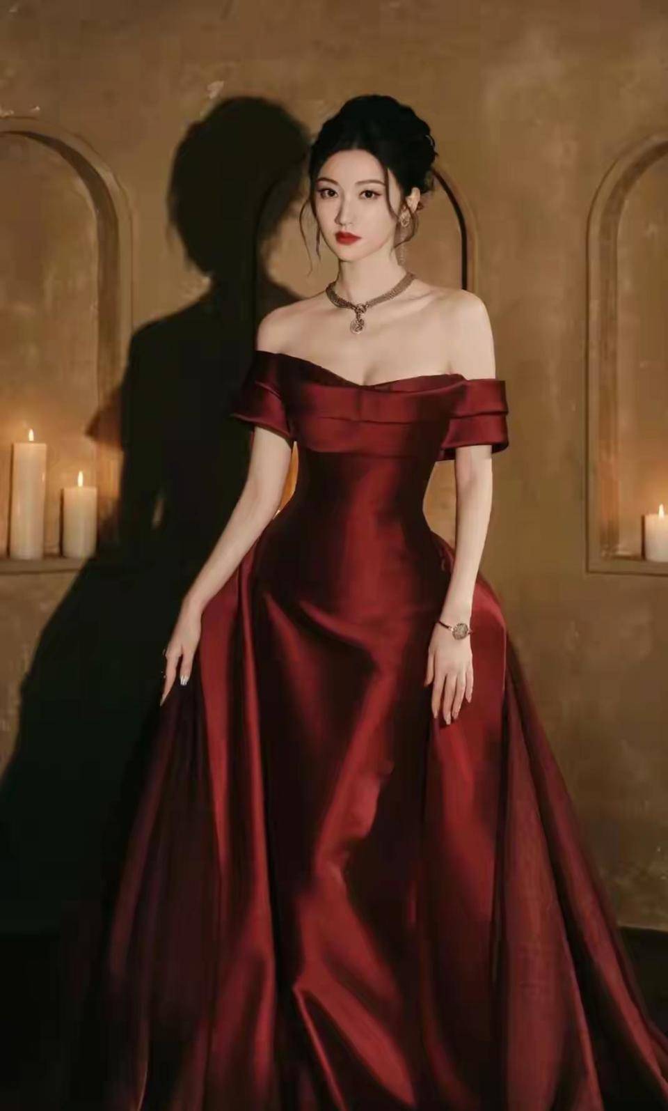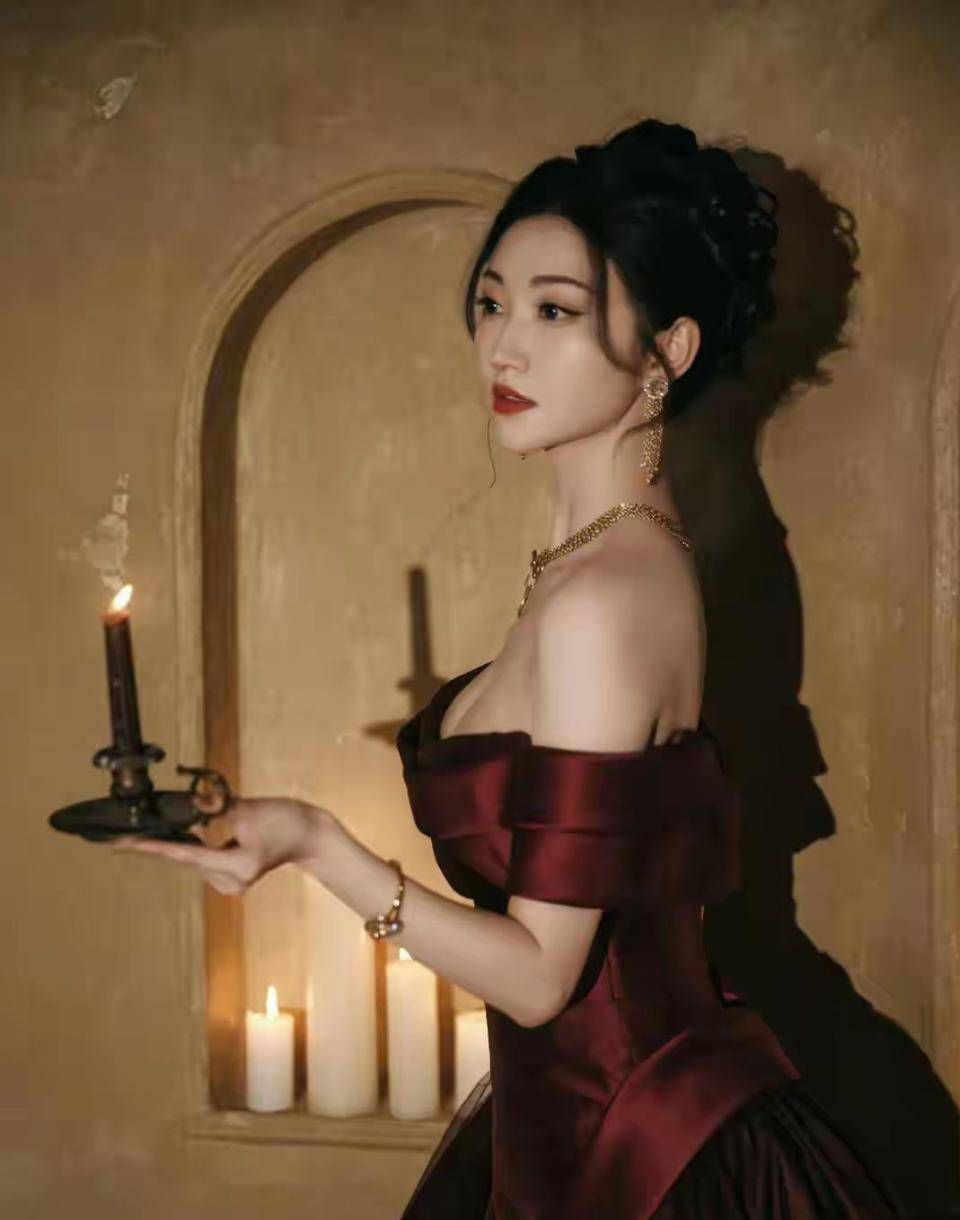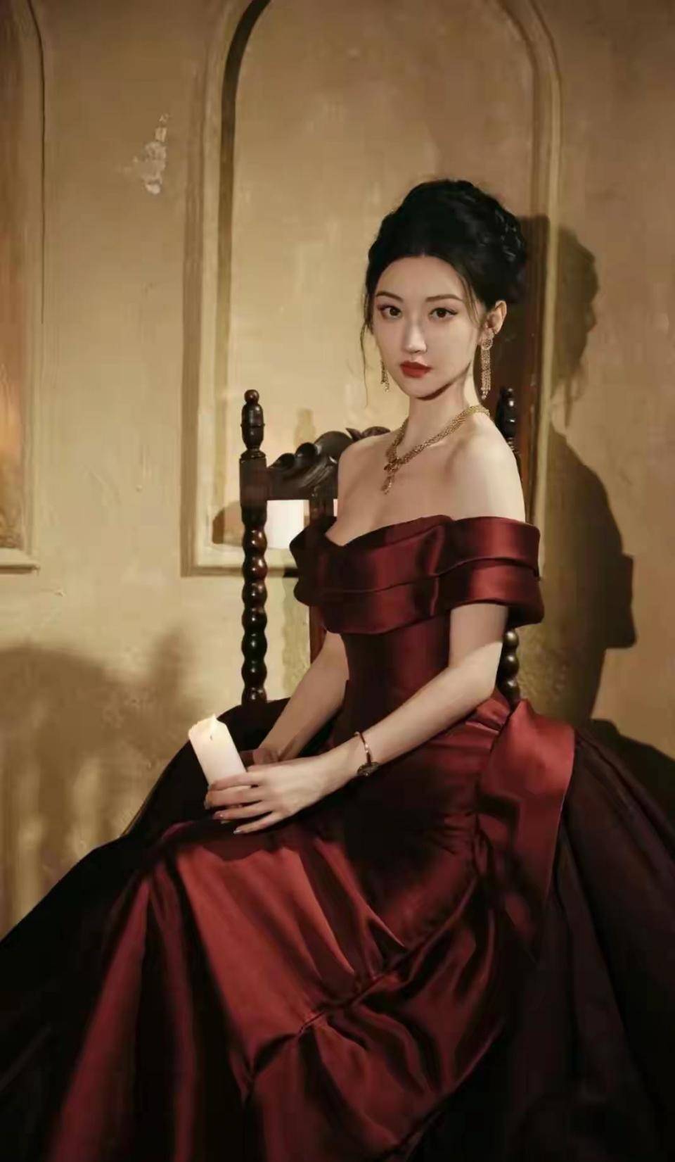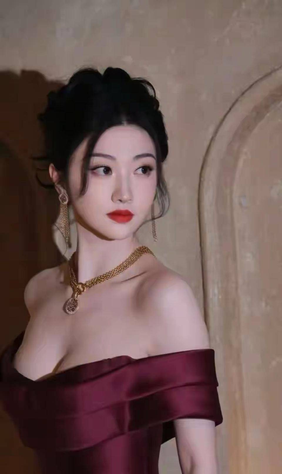 仔细观察会发现,这套造型暗含东方美学元素。 枣红色本身带有中国传统色彩韵味,丝绒材质让人联想到古典绸缎。 虽然剪裁是现代礼服,但整体气质与景甜在《司藤》中的旗袍造型一脉相承。