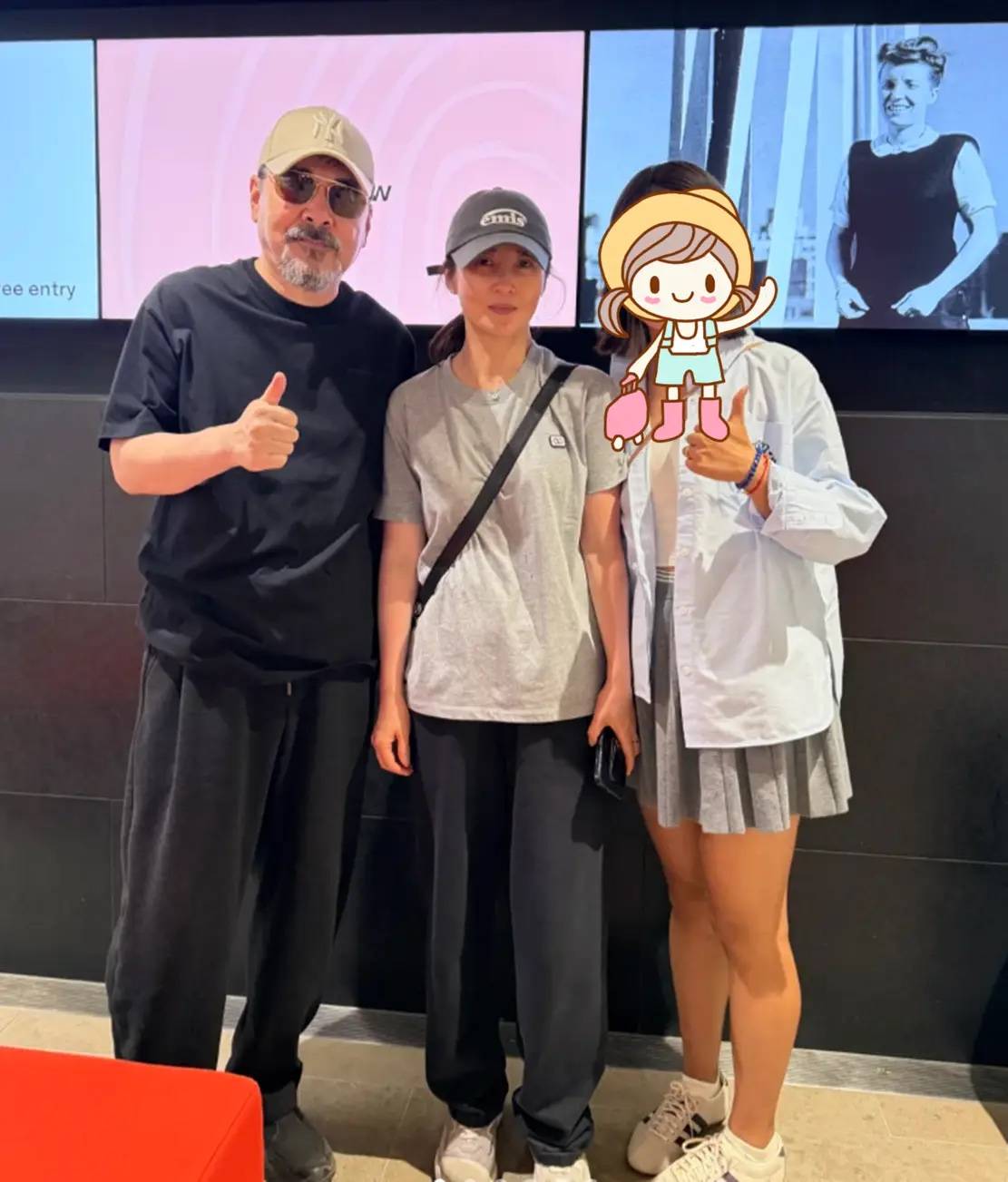 在和粉丝的合影中,陈建斌还竖起了大拇指。他穿一件黑色T恤、戴着米色棒球帽、蛤蟆镜,打扮倒是挺休闲的。