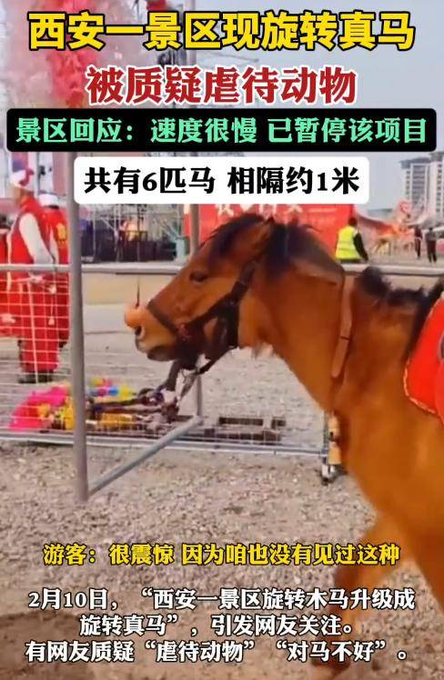 景区工作人员多次解释,项目和第三方合规合作,转圈速度极慢,全程有专人照料马匹。运营这几天,既没有马匹失控,也没有伤到游客,更不存在所谓的“虐待”行为。