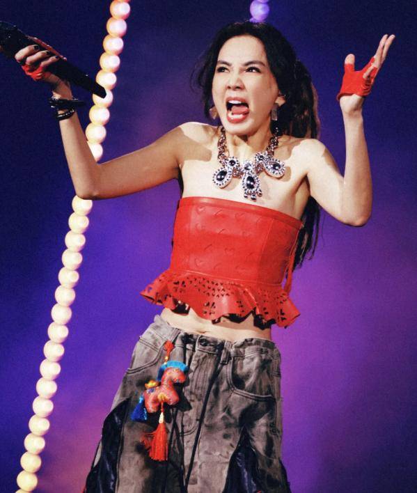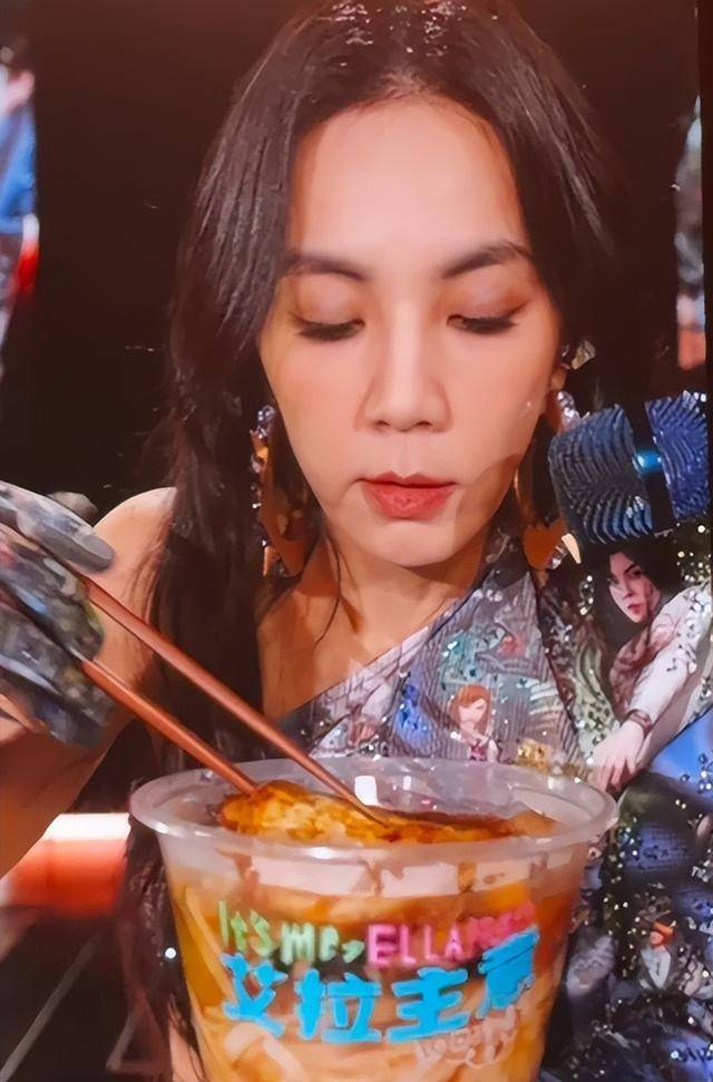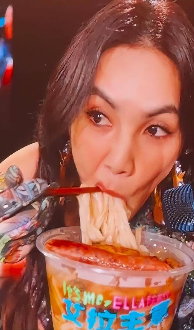 这场演出里,她还在舞台上上演嗦粉名场面,老友粉和螺蛳粉接连登场,她毫无偶像包袱地大口嗦粉,吃到尽兴时还直呼吃到老友粉就有种回家的感觉。