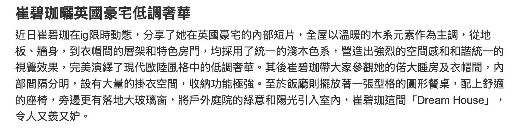 现年37岁的香港女星崔碧珈近几个月来新闻不断,先是与TVB艺人郑健乐一段似是非是的恋情闹得沸沸扬扬。这才平息不久,又被曝光在香港购买的豪宅,因为其没有按照协议付清余款,并且单方面向开发商交还了钥匙,卖方还因此而终止协议,没收了其订金,更是入禀香港高院,向其追讨占用费以及还原费共计376万元。而崔碧珈对此没有回应,早前还在英国买了豪宅,还在社交平台上大晒豪宅。