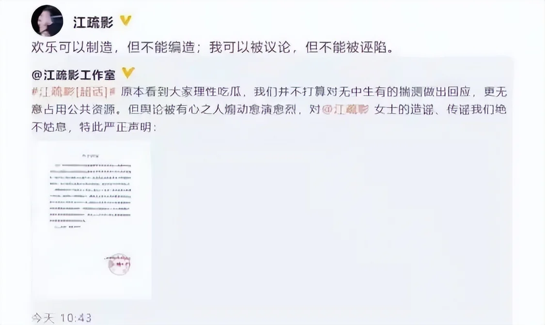 可谣言并没有就此停止,为了维护自己的名誉,江疏影没有选择沉默,而是直接拿起法律武器,收集证据起诉造谣者,用实际行动证明自己的清白。