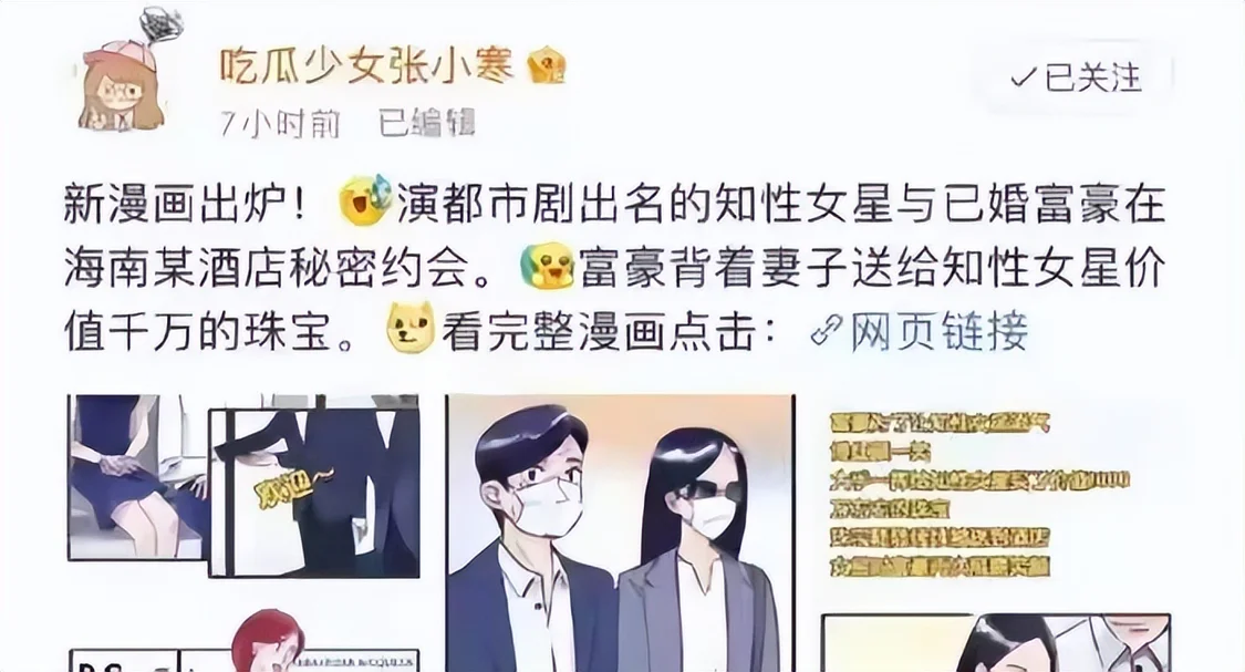 当时网上突然流出一组含沙射影的漫画,还有各种模糊的剪影,称一个留过学的都市剧女星被富商包养,还在海外给富商生了个孩子,一时间所有线索都指向了江疏影。