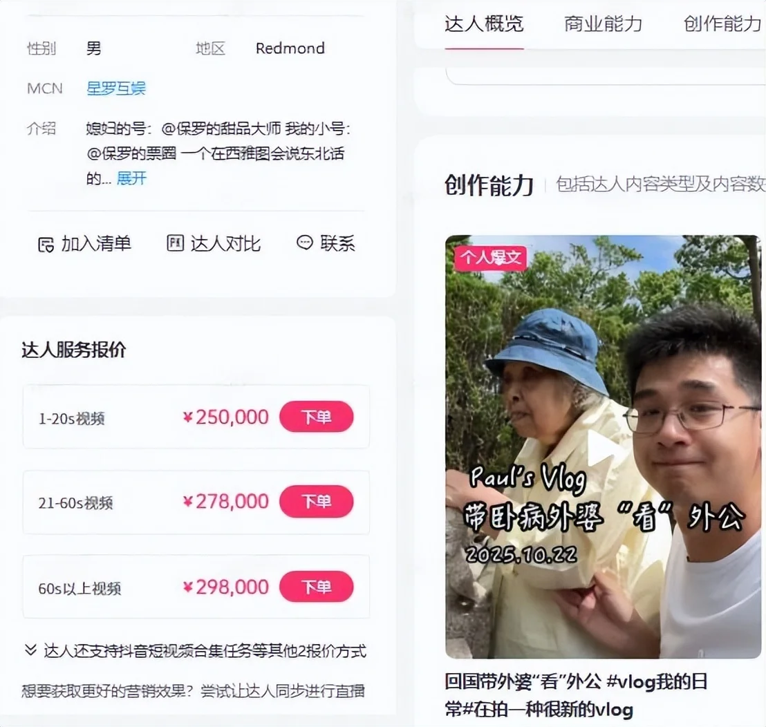 星图数据显示,他1-20秒视频报价25万元,21-60秒27.8万元,60秒以上29.8万元,且早已签约MCN“星罗互娱”,流量与金钱双收。