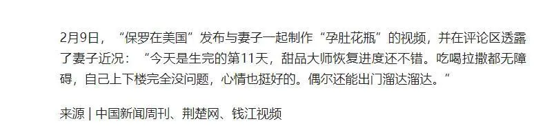 2月9日,妻子产后11天,保罗发布两人制作孕肚花瓶的视频,还在评论区轻松表示,妻子恢复不错,吃喝拉撒无障碍,能自己上下楼、偶尔出门溜达。