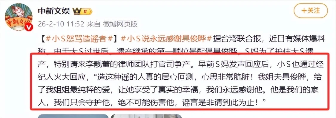 2月10日大S辞世满一周年的节点,台媒突然曝出S妈与具俊晔争夺大S遗产的消息。小S第一时间通过经纪人怒斥造谣者并直言会永远守护具俊晔。这个在大S忌日仪式上还含泪感谢姐夫