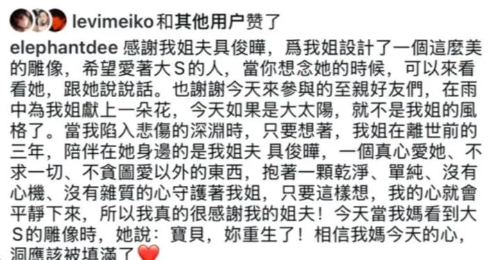 这并非小S首次力挺具俊晔,早在大S雕像揭幕时,她就曾发文称赞具俊晔干净单纯、毫无心机,用行动维护这位姐夫。