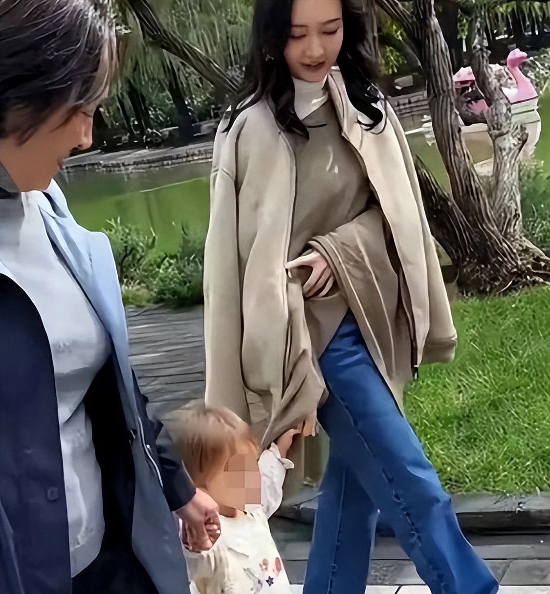 画面中,她穿着休闲,手里紧紧牵着防走失带。