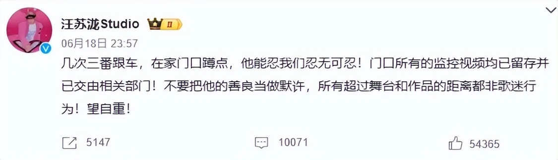 而去年,汪苏泷直接在网上曝光私生跟车、蹲点等行为。