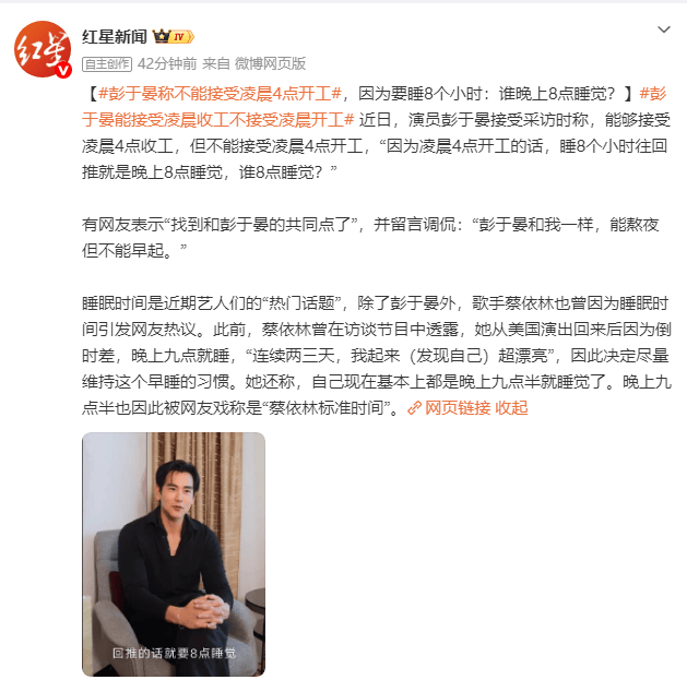 近日,演员彭于晏接受采访时称,能够接受凌晨4点收工,但不能接受凌晨4点开工,“因为凌晨4点开工的话,睡8个小时往回推就是晚上8点睡觉,谁8点睡觉?”