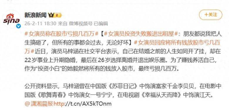 一句“朋友都说我把人生搞砸了”,揭开了演员马梓涵从云端跌落的现实。她近日在社交平台自曝,因股市投资亏损数百万元,被迫从800平方米的豪宅搬进80平方米的出租屋。