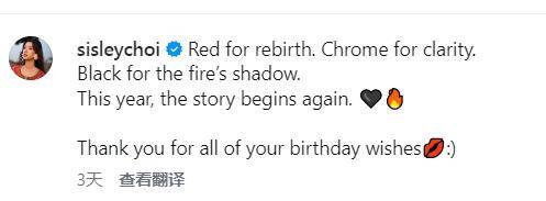 蔡思贝日前分享了一辑庆生美照,一句英文留言耐人寻味:“Red for rebirth... This year, the story begins again.(红色象征重生……今年,故事重新开始。)”疑似暗示以自由身重新出发。
