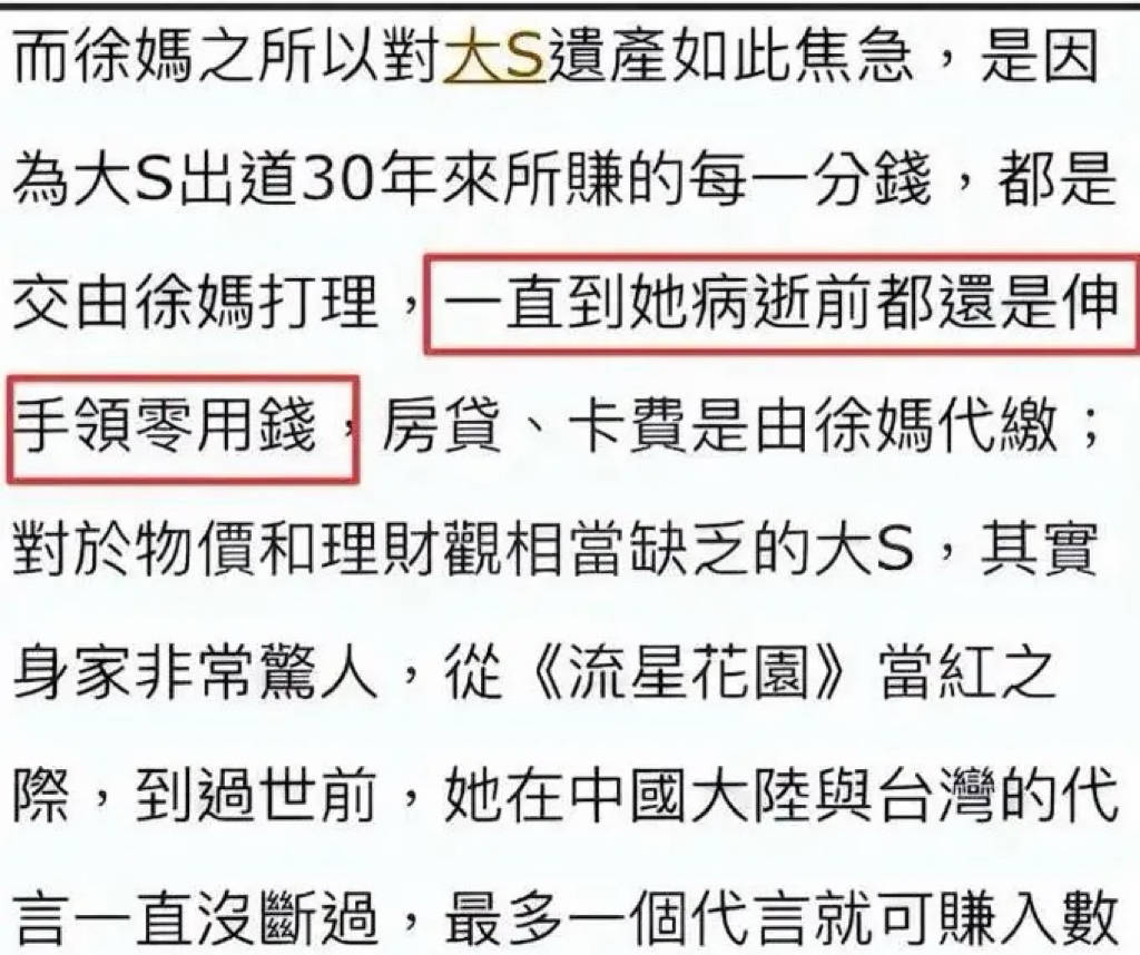 大S出道30年来所赚的每一分钱,都是交给S妈打理的,一直到她病逝前都在伸手领零用钱。大概这也是为什么,黄春梅会对大S遗产如此焦急的原因吧。