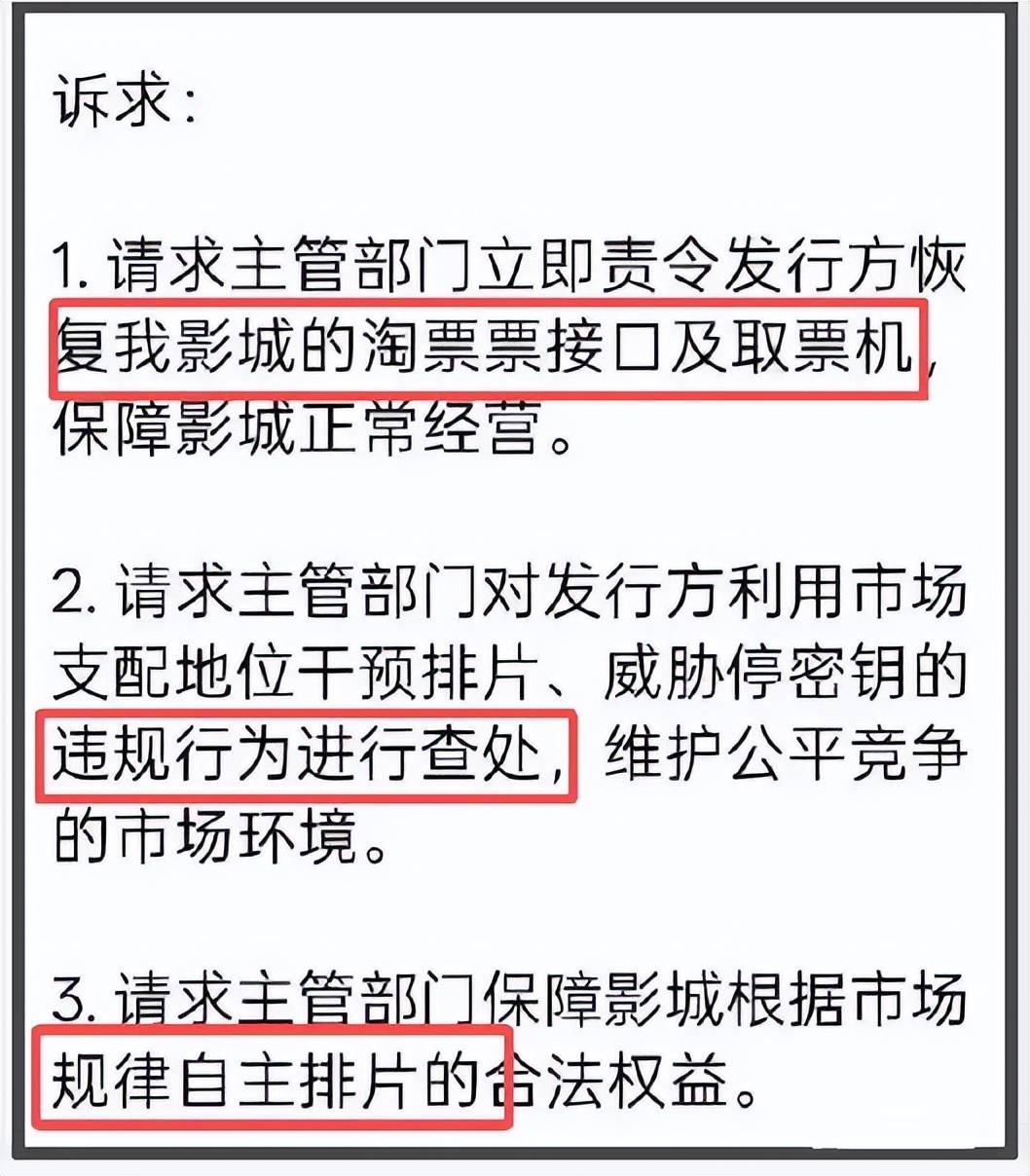 同时,院线的诉求是要求主管部门责令发行方恢复售票接口及售票机,处置威胁停止密钥的违规行为,保障自由市场的公平性。