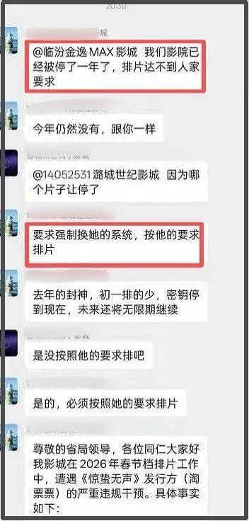 率先反抗的是山西影院群,群内聚集了390位院线负责人。其中一位发布了长篇控诉,指出《惊蛰无声》发行方淘票票违规干预市场的几个问题,其一强制排片扰乱市场秩序,不满23%的排片占比要更多,其二非法断供售票机及售票接口,其三拿停止密钥供给威胁提高排片。