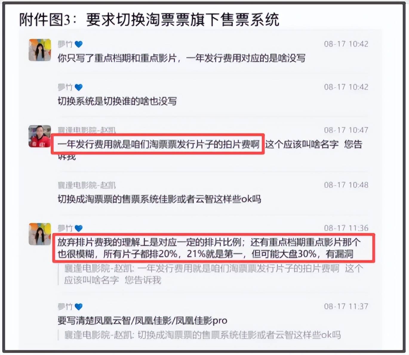 在双方协商过程中,发行方解释放弃排片费用就是对应一定的排片比例,指责对方的措辞模糊,对重点影片的排片方案不够清晰,举例所有片子20%,21%就可能是第一,但大盘可能到30%,由此也能看出该发行方的大胃口。