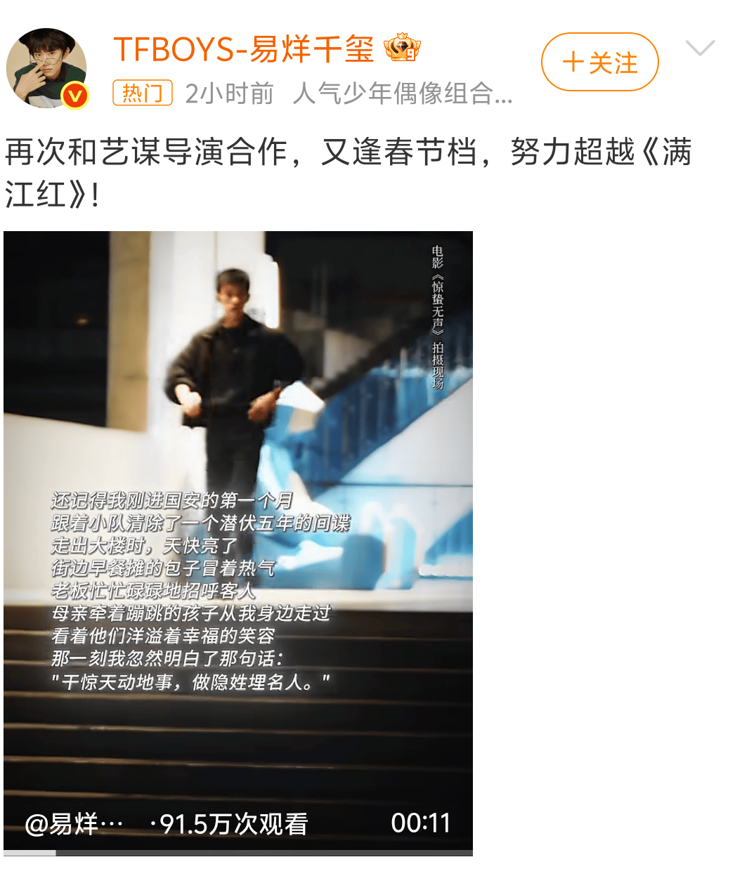 2026年春节档的“瓜田”又双叒叕热闹起来了!2月11日,易烊千玺在微博甩下一句“努力超越《满江红》”,瞬间让网友集体“瞳孔地震”——这波操作是“凡尔赛”还是“真·硬核挑战”?毕竟《满江红》可是2023年票房冠军,45亿的战绩至今让其他电影“瑟瑟发抖”。不过,看完《惊蛰无声》的预告和阵容,小编只想说:千玺弟弟,这波flag我信了!