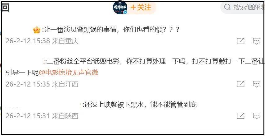 目前《惊蛰无声》账号评论区都是易烊千玺粉丝维权,他们要求片方尽快处理网络负面舆论,不要影响到易烊千玺,同时认为易烊千玺遭到了某些人的针对,被下了黑稿。