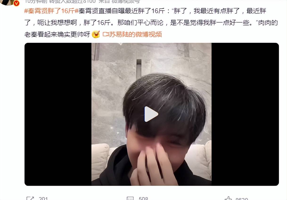 秦霄贤直播自曝最近胖了16斤:“胖了,我最近有点胖了,最近胖了,呃让我想想啊,胖了16斤。那咱们平心而论,是不是觉得我胖一点好一些。”
