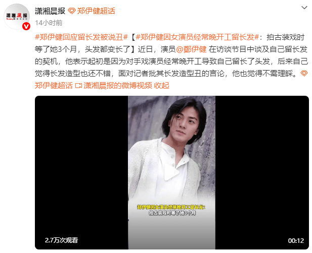 近日,演员郑伊健在访谈节目中谈及自己留长发的契机,他表示起初是因为对手戏女演员经常晚开工导致自己留长了头发,“拍古装戏时等了她3个月,头发都变长了”,后来自己觉得长发造型也还不错,面对记者批其长发造型丑的言论,他也觉得不需理睬。
