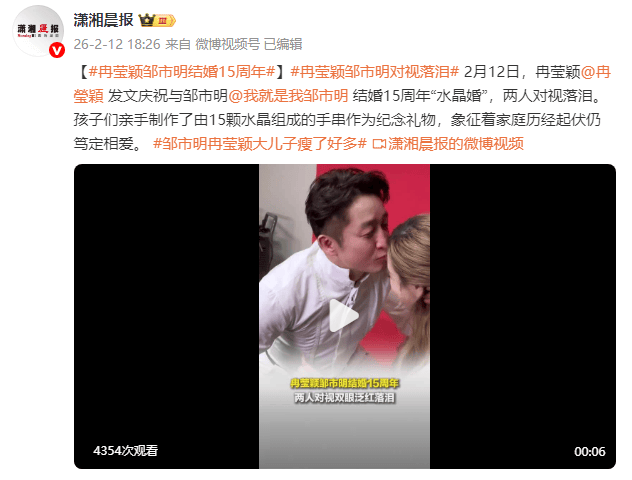 2月12日,冉莹颖发文庆祝与邹市明结婚15周年“水晶婚”,两人对视落泪。孩子们亲手制作了由15颗水晶组成的手串作为纪念礼物,象征着家庭历经起伏仍笃定相爱。