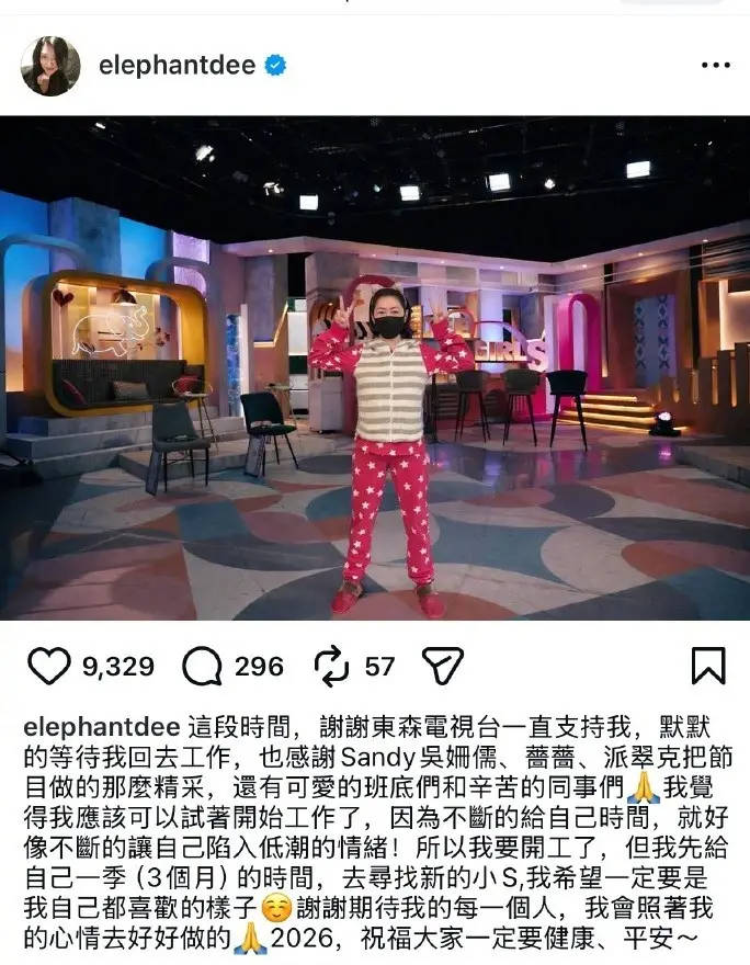 13日,小S在社交平台上宣布复工:“我觉得我应该可以试着开始工作了,因为不断的给自己时间,就好像不断的让自己陷入低潮的情绪”,她还表示想给自己3个月的时间,去寻找新的小S。