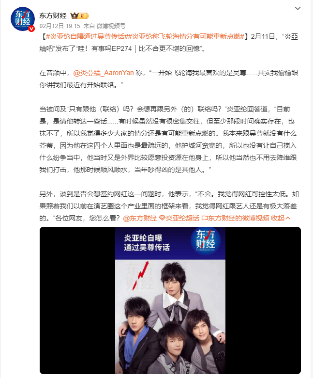 2月11日,炎亚纶在音频中聊到飞轮海,他称“一开始飞轮海我最喜欢的是吴尊......其实我偷偷跟你讲我们最近有开始联络。”