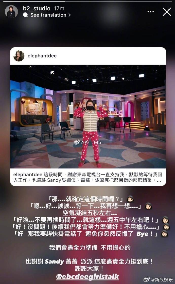 随后制作人B2转发,分享了跟小S谈复工过程,表示谈好之后就立刻挂断了电话,生怕小S后悔。节目组还特别为小S打造了特别企划,《小姐不熙娣》之《主持复健之路》特辑预计将于4月份正式播出。