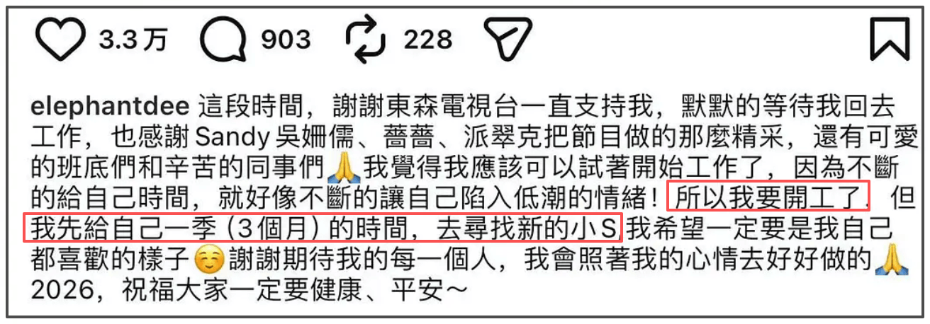 小S发文称:“我觉得我应该可以试着开始工作了,因为不断的给自己时间,就好像不断的让自己陷入低潮的情绪”,她表示想给自己3个月的时间,去寻找新的小S。
