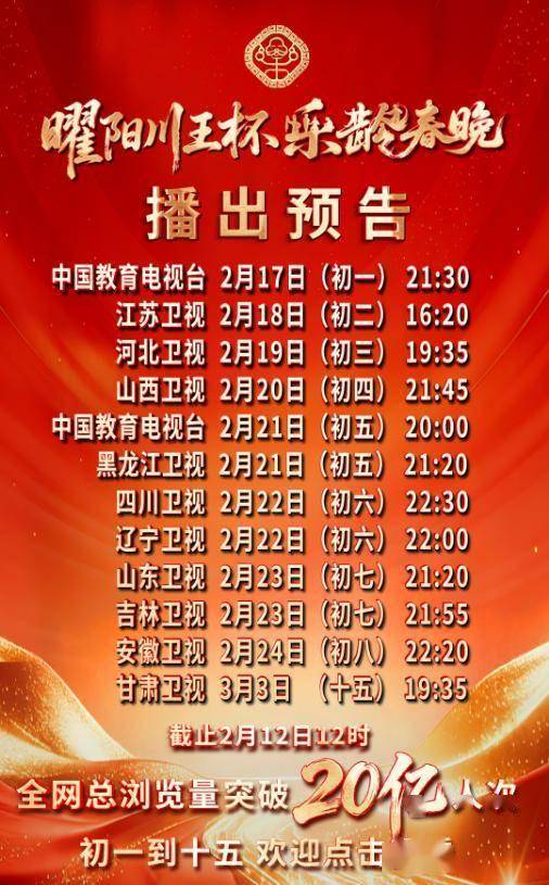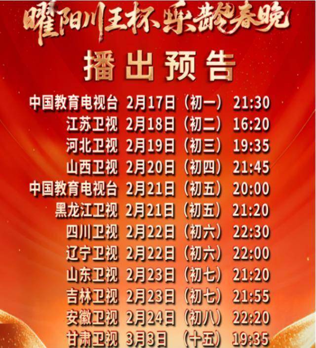 2月12日,曜阳川王杯乐龄春晚公布了春节期间在各个电视台的播出计划,总共有11家电视台从大年初一到元宵节分成12轮播出。