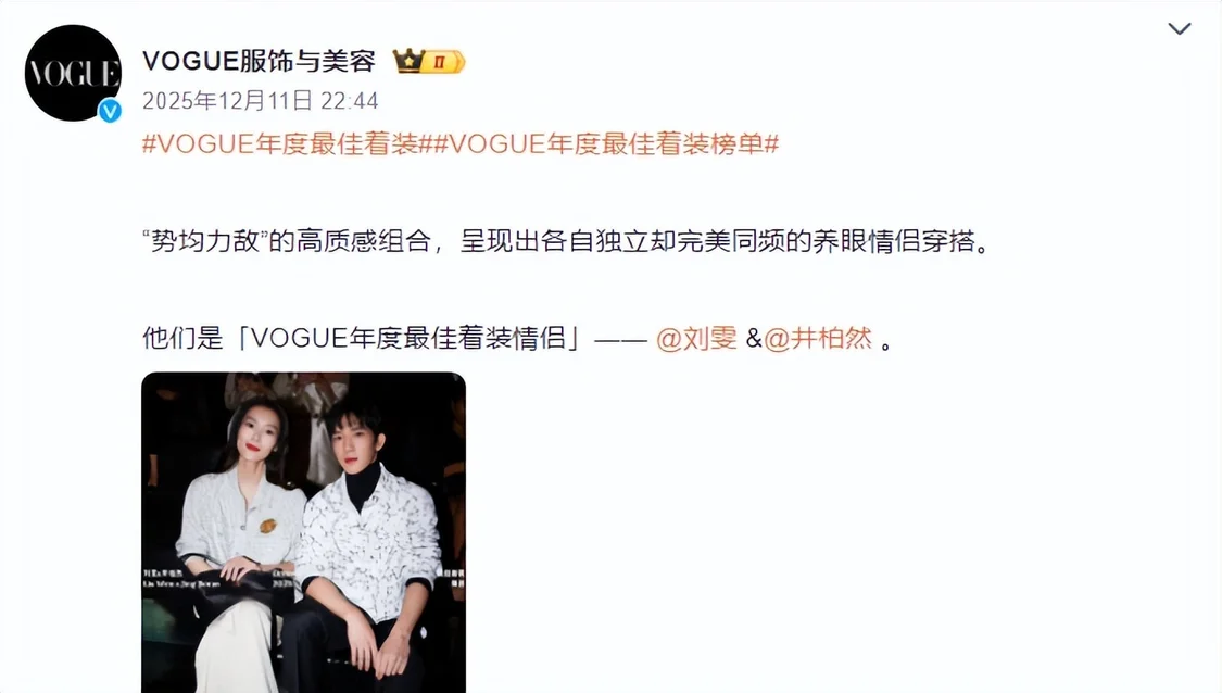 2025年底,两人获得VOGUE杂志的“最佳着装情侣”的称号。