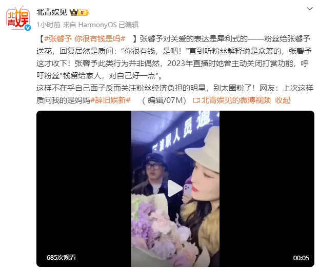 张馨予的关心向来直白又犀利——有粉丝给她送花,她当场直言反问:“你很有钱是吧!”直到得知鲜花是大家一起众筹买来的,她才暖心收下。其实这并非个例,早在