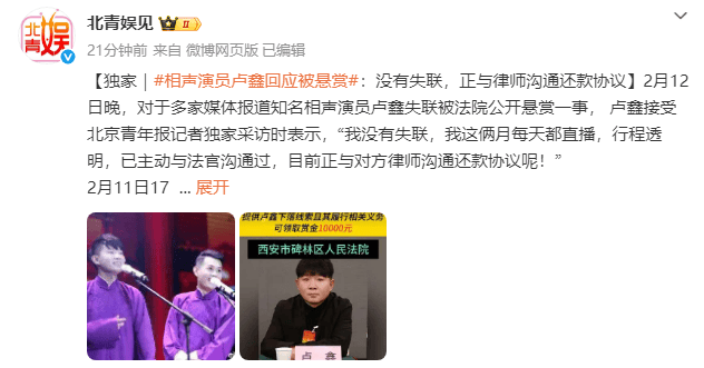 2月12日晚,对于多家媒体报道知名相声演员卢鑫失联被法院公开悬赏一事, 卢鑫接受北京青年报记者独家采访时表示,“我没有失联,我这俩月每天都直播,行程透明,已主动与法官沟通过,目前正与对方律师沟通还款协议呢!”