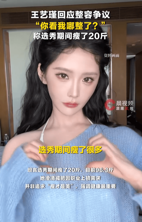(来源:潇湘晨报)2月13日,王艺瑾在直播回应“整容”争议,她笑问:“你看我哪整了?”王艺瑾呼吁审美多元化,自信健康就是美。她坦言选秀期间瘦了20斤,目前96.3斤,她