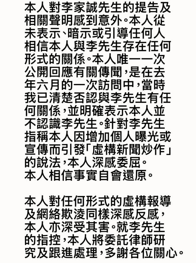 今日晚上,周秀娜在社交平台作出回应:本人对李家诚先生的提告及相关声明感到意外。本人从未表示、暗示或引导任何人相信本人与李先生存在任何形式的关系。本人唯一一次公开响应有关传闻,是在去年六月的一次访问中,当时我已清楚否认与李先生有任何关系,并明确表示本人并不认识李先生。针对李先生指称本人因增加个人曝光或宣传而引发虚构新闻炒作的说法,本人深感委屈。