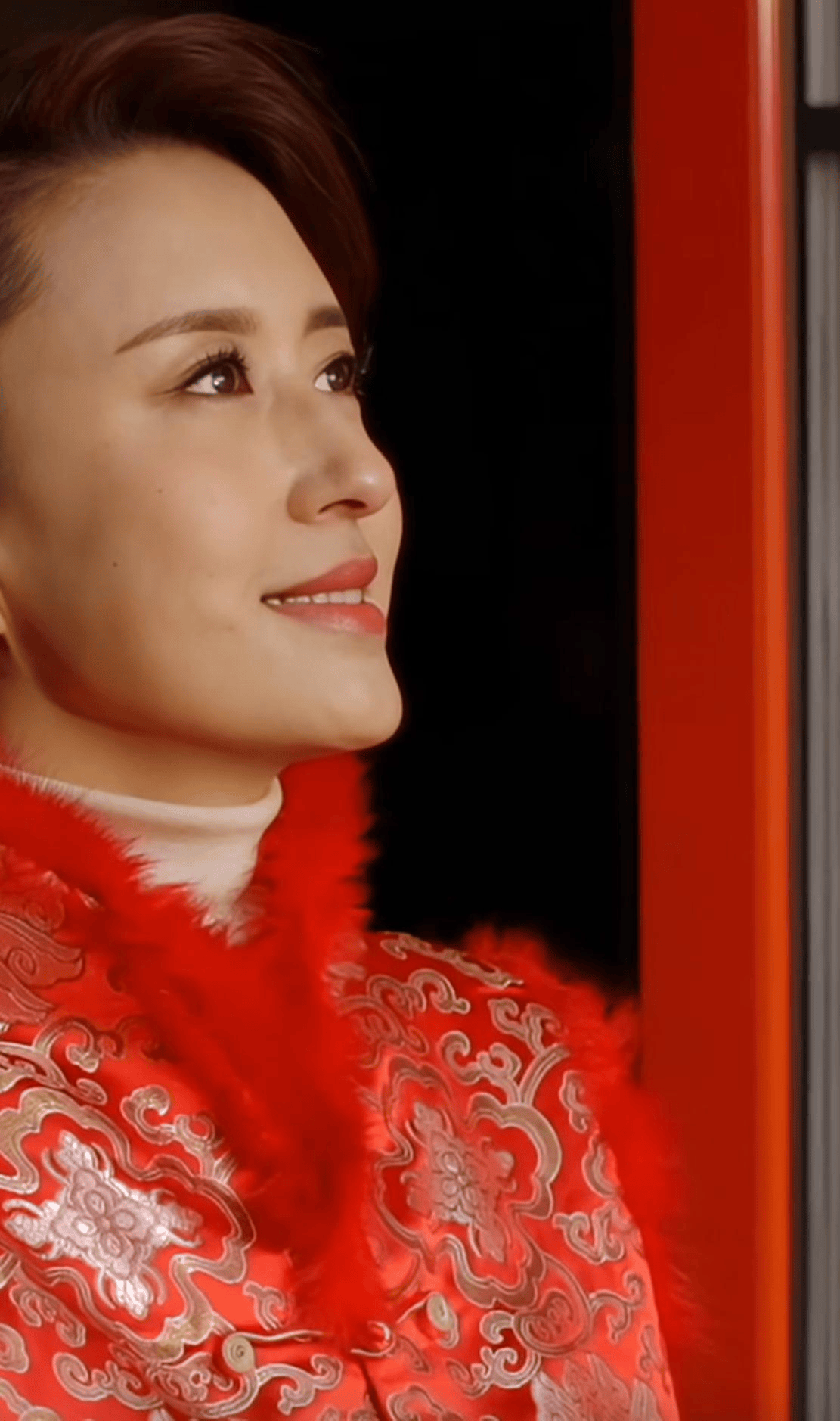视频里,张蕾身着一件绣着金色花纹的红色中式立领马甲,内搭一件白色的打底衫,头上的红色发饰和整体的喜庆装扮,立刻就营造出浓浓的年味。她化着精致的妆容,脸上带着温婉又自信的笑容,显得优雅又端庄。