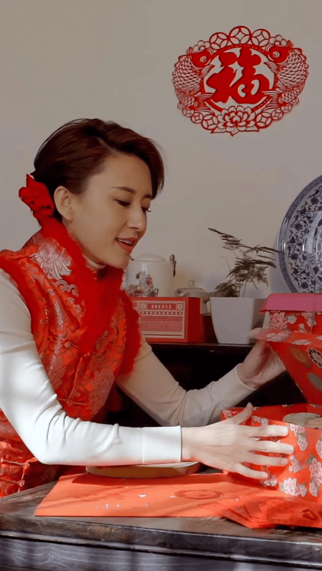 换上新装的张蕾,开始动手制作一些过年的传统装饰。她坐在桌前,手里拿着剪刀和红色的纸,非常专注地剪着窗花,看得出来她对这些传统手工艺很有感情,也做得相当细致。视频的背景是充满中式风格的室内,窗户透进的阳光,让整个画面显得格外温馨。