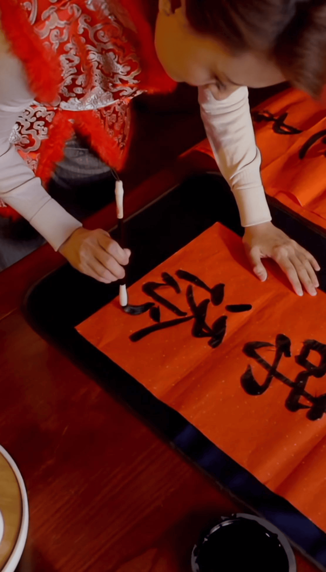 更让人印象深刻的是,张蕾还亲手写了春联。视频中,她伏在一张深色木桌上,手握毛笔,在红底洒金的宣纸上挥洒自如。她的身体微微前倾,神情专注,墨迹浓黑饱满,笔画之间都透着一股扎实的书法功底。写完春联,她并没有等到除夕夜,而是直接就把它贴在了自家大门口。