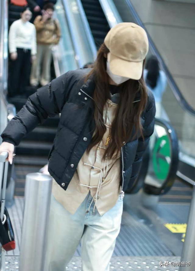 当天她穿了件黑色新中式克罗心羽绒服,配着浅色休闲裤,脸上只戴了口罩,素颜的样子和平时镜头里的精致判若两人。