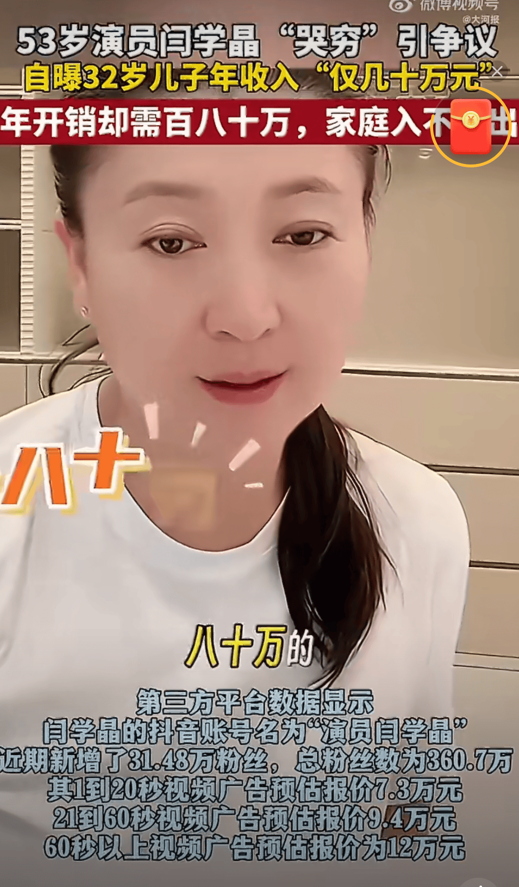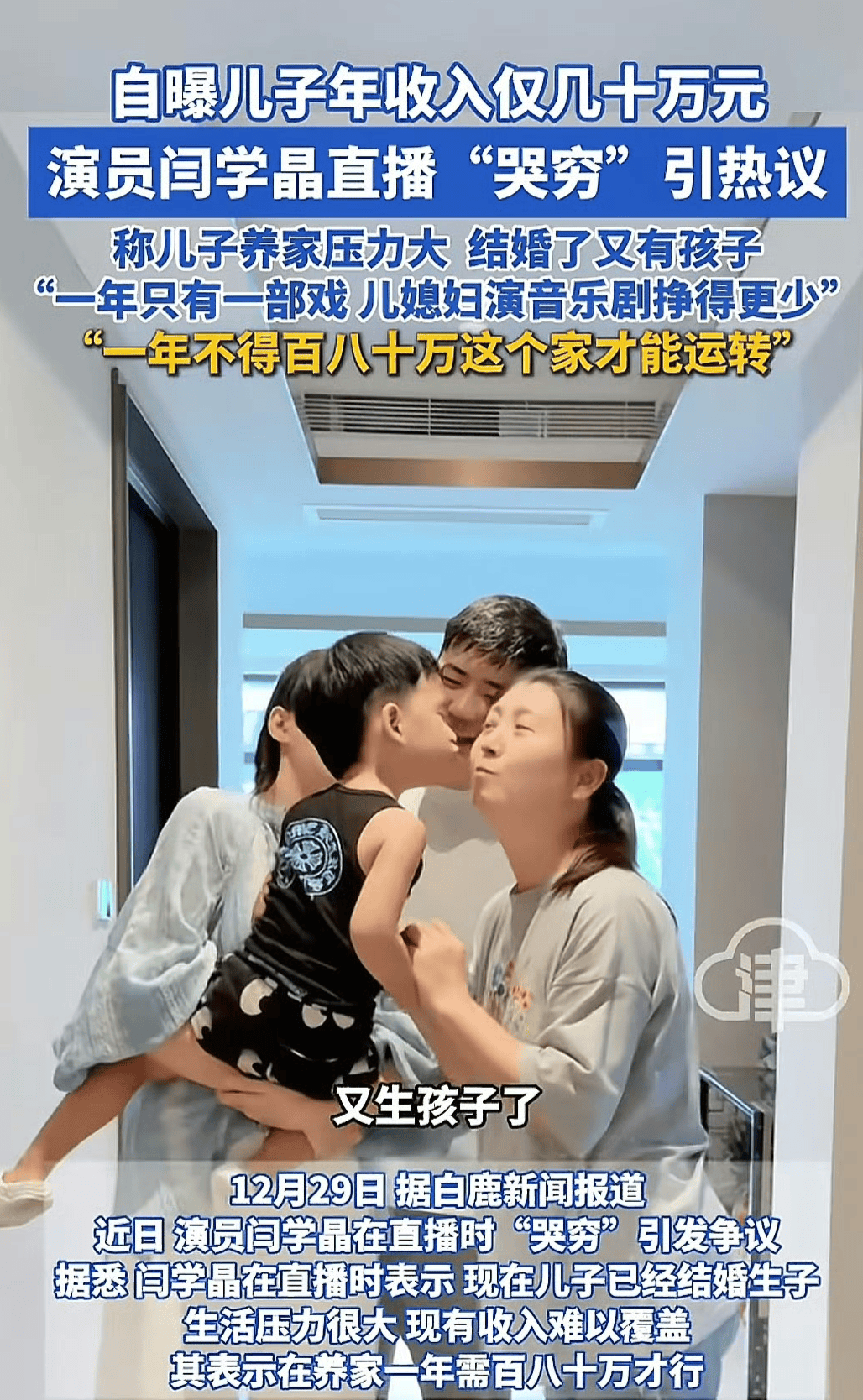 2025年底闫学晶在直播间抹着眼泪说:“我儿子拍戏一年才挣二三十万,儿媳更少,在北京养家一年没百八十万根本转不动!”这话一出,网友直接炸锅了——“合着年入40万是贫困户?那我等打工人岂不是‘负翁’?”“建议查查闫老师家的消费标准,是不是用金子砌厕所?”