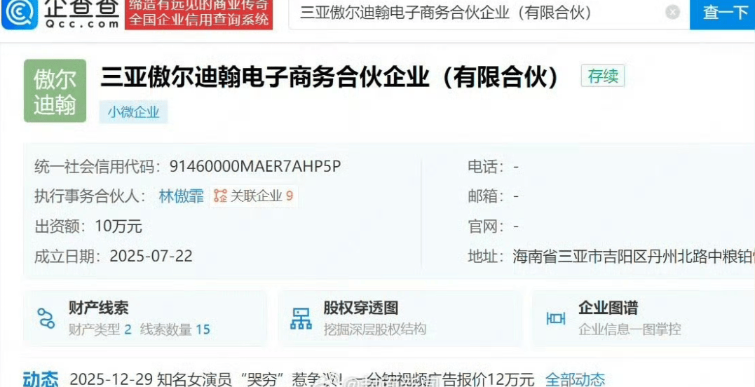 林傲霏和徐梦迪也不是吃素的。2025年7月,两人砸了10万块,在三亚成立了“傲尔迪翰电子商务公司”,卖食品、化妆品和衣服。本想靠着老妈的明星光环带带货,结果老妈的“哭穷”直接把公司送上了热搜——“这公司怕不是卖‘何不食肉糜’同款奢侈品吧?”“建议改名叫‘凡尔赛小卖部’!”