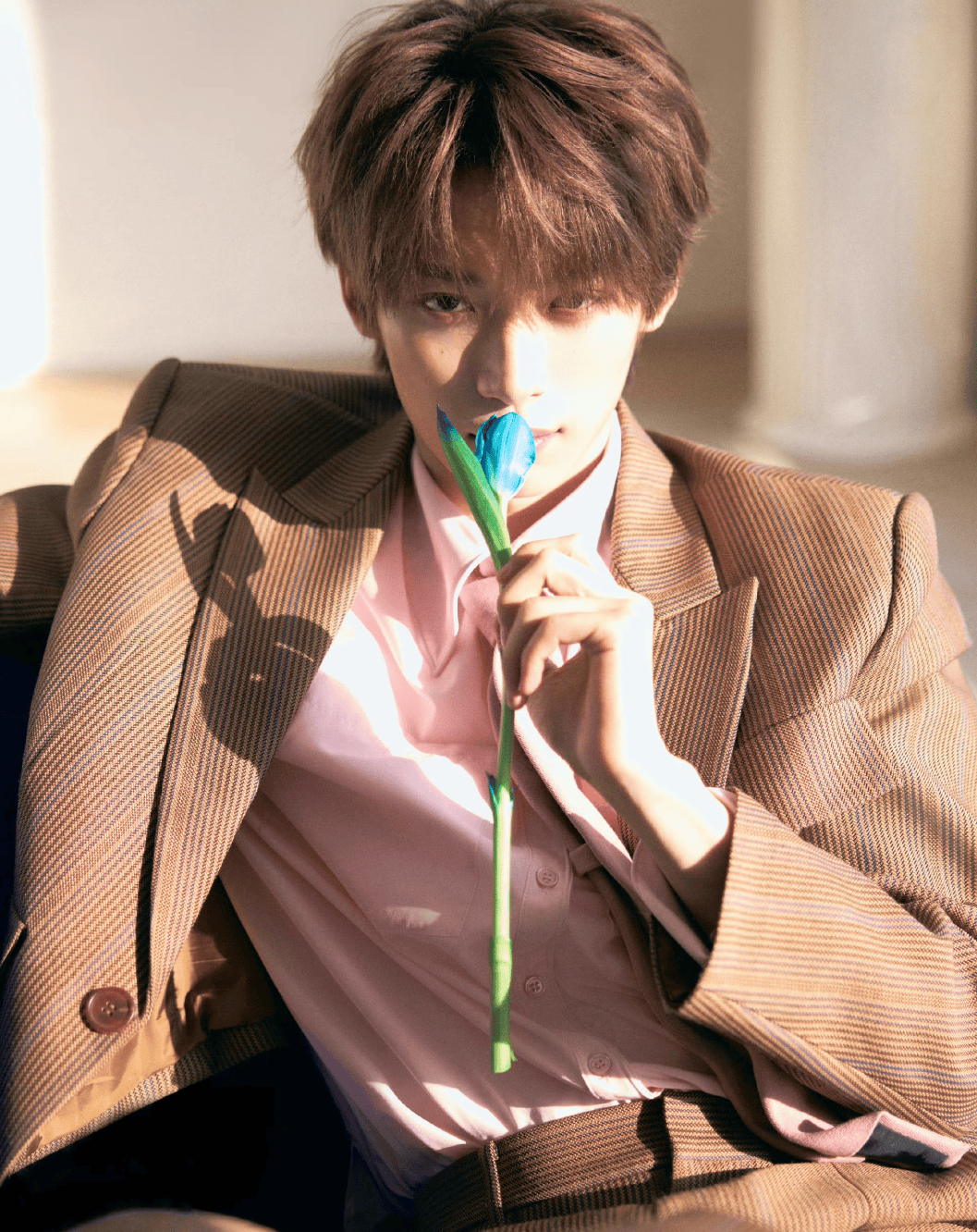 2026年情人节娱乐圈最甜的“糖”居然是梓渝发的!别人家爱豆情人节要么官宣恋情,要么晒玫瑰花,咱们梓渝直接端出一盘“视觉盛宴”——九宫格写真里,他穿着粉色衬衫配棕色西装,手持蓝玫瑰和蓝郁金香,眼神温柔得能掐出水,粉丝集体尖叫:“这哪是写真?这是把民政局搬来了吧!”